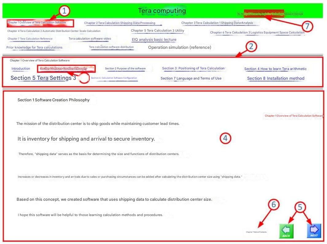 1. Click on "Chapter 1: Overview of Tera Calculation Software" ① in the top column , 2. Sub-table of contents ② will be displayed in the middle column. 3. Click on "Section 1: Software Development Philosophy" ③ in the middle column ②, 4. The text corresponding to "Section 1: Software Development Philosophy" will be displayed in the bottom column ④. 5. Button ⑤ is a link button to move to the previous and next pages. |