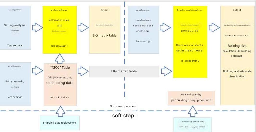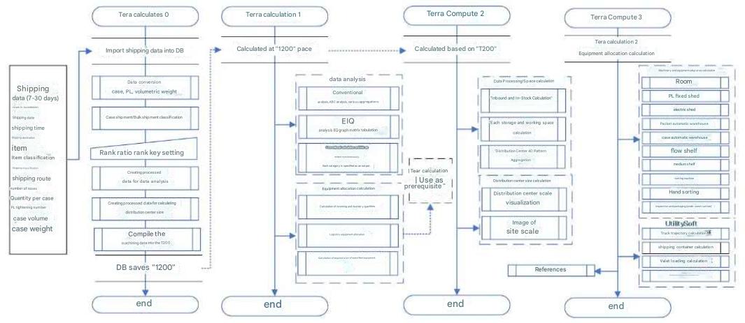 | Tera Calculation Software Tera Calculation 0 - Shipping Data Processing Frequently used calculations in Tera Calculation 1 and Tera Calculation 2 are pre-calculated and stored in Access (the "T200" table). Tera Calculation 1 and Tera Calculation 2 are based on "T200." Tera Calculation 1 - Shipping Data Analysis Calculation/Equipment Allocation Using EIQ analysis, data is divided into 25 categories by shipping rank and output to an EIQ matrix table. In addition, equipment is allocated to the EIQ matrix table and the required size of that equipment is calculated. Tera Calculation 2 calculates incoming and outgoing shipments and inventory, calculates the required floor space for each piece of equipment according to Tera settings, and automatically calculates distribution center size and site area. You can change one or more Tera settings and recalculate with all changes reflected. Calculates 40 different building sizes, including the number of building floors and berths. This allows you to visualize the tradeoff between building size and site size. Tera Calculation 3 is a utility software that calculates the floor space of each piece of equipment. After calculating the required size of equipment using Tera Calculation 1, the software user calculates the floor space for each piece of equipment and sets the size of the distribution center. By imitating the procedures and methods used in Tera Calculation 2, users can learn how to set the size of a distribution center using Tera Calculation 3. Reference materials are also included. Tera Calculations commonly distinguish between case-based and bulk shipments. Selective aggregations are available for the number of shipments, number of bulk shipments, case conversion, product liability conversion, volume conversion, and weight conversion. These aggregations can also be conditionally aggregated by specifying "shipping time," "shipping route," "item classification," and "shipping classification." In addition, calculations are performed simultaneously using the calculation method and the EIQ method, allowing users to check the differences. |