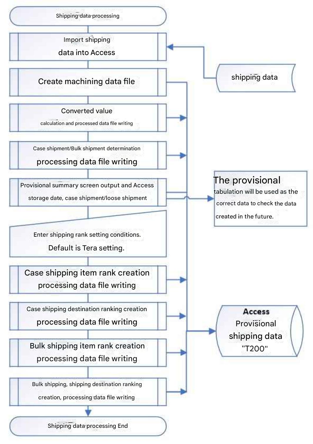 TTera Calculation 0 is software that pre-calculates frequently used calculations from Tera Calculation 1 and Tera Calculation 2, which process shipping data, and creates the Access "T200" table. 1. Separates shipping data into case shipments and bulk shipments. 2. Converts bulk shipments into case counts, product liability numbers, volume, and weight. 3. Aggregates shipping destinations and items, and creates destination and item ranks. 4. Creates a data file called "T200" that compiles these data. Details of "T200" are explained separately. The process is described in the flow diagram on the left . There used to be a saying called the "2:8 rule," which meant that 80% of the volume shipped came from 20% of the items. 30-40 years ago, when management was not as thorough, dead stock was also stored, and the ratio was roughly the same. Currently, information is fast and accurate, so measures are taken to reduce inventory of low-flow products early on, so 20% of items account for 50% of the volume, and 30% of items account for 65-70%. By categorizing and aggregating these high-flow and low-flow items, or high-flow and low-flow shipping destinations, and effectively allocating equipment and work operations, an efficient distribution center can be created. |