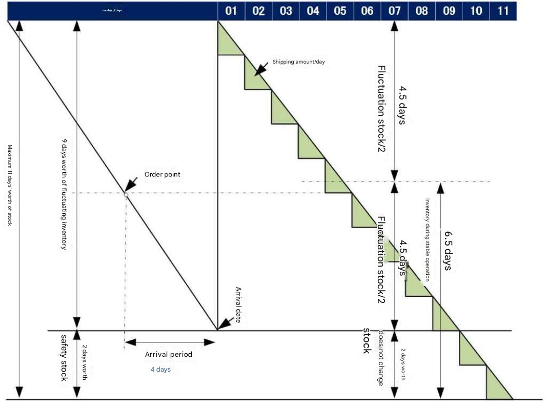 Shipping volume/day uses the average value of all data. Tera calculates inventory storage volume using the following method: Inventory volume (storage volume) during stable operation = Safety stock + (Fluctuous stock/2) Fluctuous stock = Maximum inventory - Safety stock. For example, suppose there are 18 items with a maximum inventory period of 11 days, safety stock period of 2 days, and fluctuating inventory period of 9 days . If three of these 18 items are received every day , the fluctuating inventory storage volume = (Fluctuous inventory/2). If calculating inventory volume (storage volume) during steady operation seems impossible in practice, you can simply add a margin rate after the above calculation. |