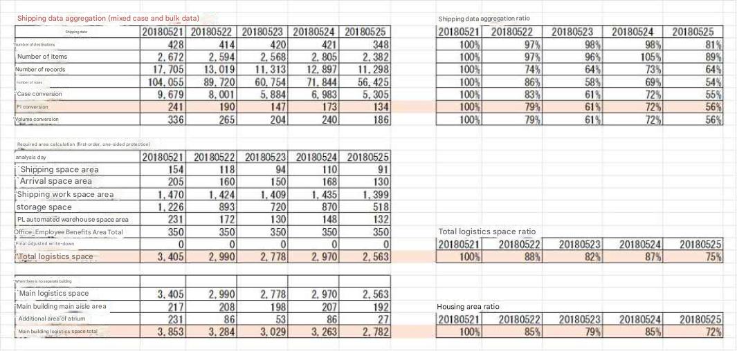 The logistics space area is calculated by separately calculating the shipping space area, receiving space area, shipping work space area, storage space, and office / welfare area . These areas can be shared during non-working hours or by devising work operations. Spaces that can be shared to reduce the logistics space area are receiving and case sorting. Also, spaces that must be added to the above calculations include the material and auxiliary material storage area and the main aisle.