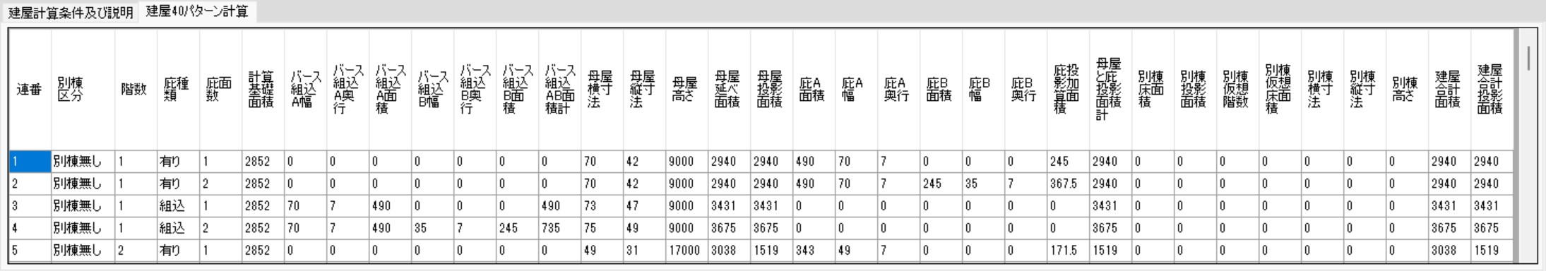 | There are 40 different building type patterns: 2 separate building categories (separate building A and separate building B have the same area) * 5 floors * 2 with or without eaves * 2 berth surfaces = 40 different patterns. The area and main dimensions of these 40 patterns have been calculated and compiled into a list ( which can be exported to Excel ). The site area screen obtains building information from this list. |