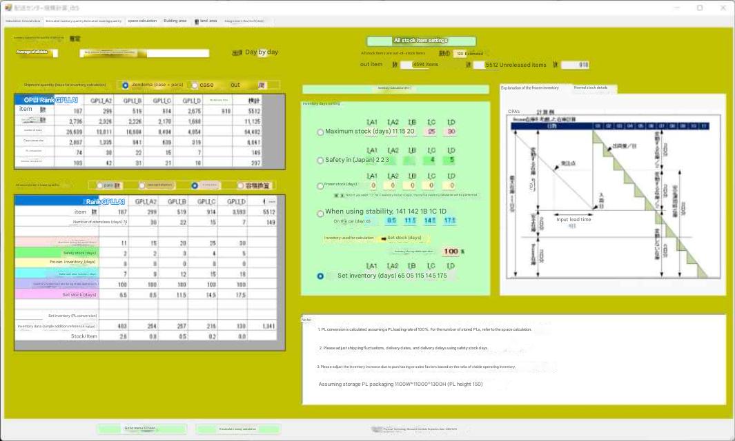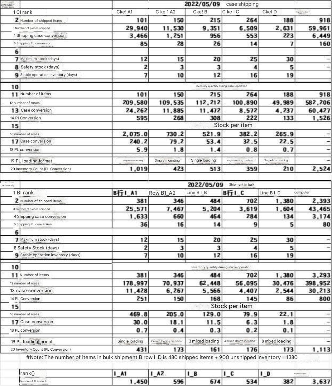 The method for calculating inventory quantity from shipping data was described in the previous section. As an example, we will explain the procedure for calculating inventory quantity ( PL equivalent) from shipping data 2022/05/09 . 1. Calculate the shipping quantity for 2022/05/09 by item rank (sequential numbers 1-5 ). 2. Specify the maximum inventory quantity (days) and safety stock (days) (sequential numbers 7-8 ) and calculate the stable operation inventory (days). The formula is stable operation inventory = (maximum inventory ( days ) - safety stock ( days ) ) / 2 + safety stock ( days ) (sequential number 9 ). 3. Calculate the stable operation inventory quantity. The formula is shipping volume * stable operation inventory (days). 4. Calculate stable operation inventory * shipping volume (sequential numbers 10-14 ). For serial numbers 16-18 , calculate stable operation inventory / number of items. 5. The key to this spreadsheet is calculating the pallet loading method. Single loads are 1 item loaded on a pallet, 2-item mixed loads are 2 items loaded on a pallet, and in mixed loads the first number indicates the number of items loaded on the pallet. The method for distinguishing single loads and mixed loads is that if the inventory per item ( PL conversion) is 0.5PL or more it is a single load, 0.5PL to 0.33 is a 2- item mixed load, 0.32 to 0.25 is a 3- item mixed load , 0.24-0.125 is a 4- item mixed load, and 0.125 or less is an 8- item mixed load. The PL conversion for mixed loads is calculated as the number of items / number of items loaded in the PL . |