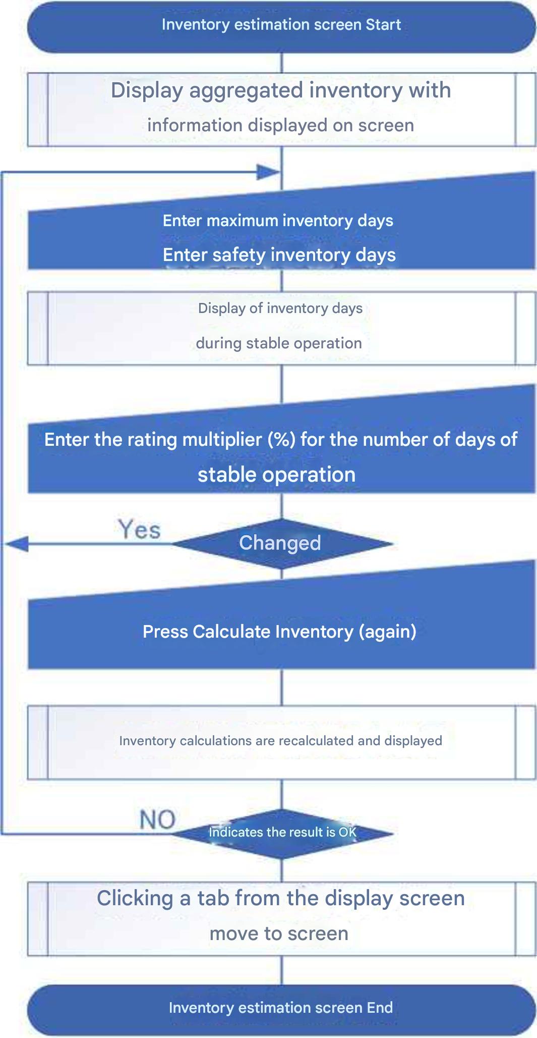 The left figure shows the flow of the inventory estimation screen for tera calculation 2. Inventory refers to the quantity of goods received and stored in advance for shipment. Let's explain with an example calculation. In the diagram below , if the shipping quantity is 10 units per day, then "Maximum inventory = number of shipments * maximum inventory period = 10 * 8 = 80 units", "Average inventory = maximum inventory