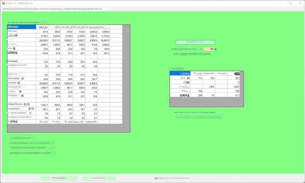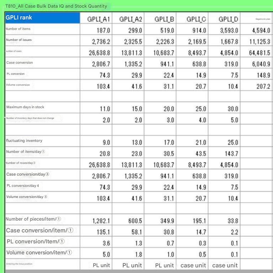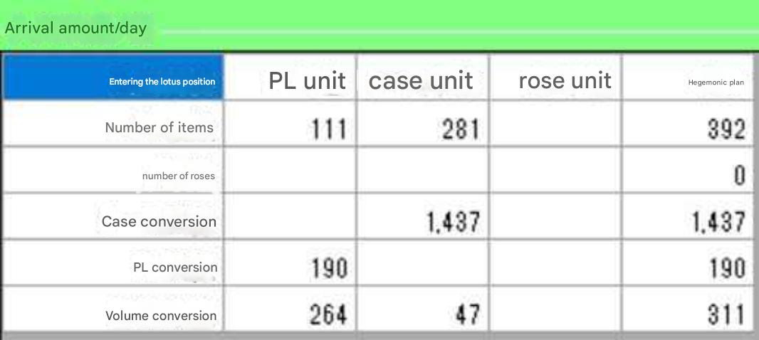 The daily volume of goods received was 190 pallets (PL) of 111 items, and 1,437 cases of 281 items. A total of 392 items (190 PL + 1,437 cases) arrived. The volume at that time was 311 m3. Note: This calculation is a simple calculation of the PL conversion of shipping data. The number of loads per PL must be taken into consideration. |