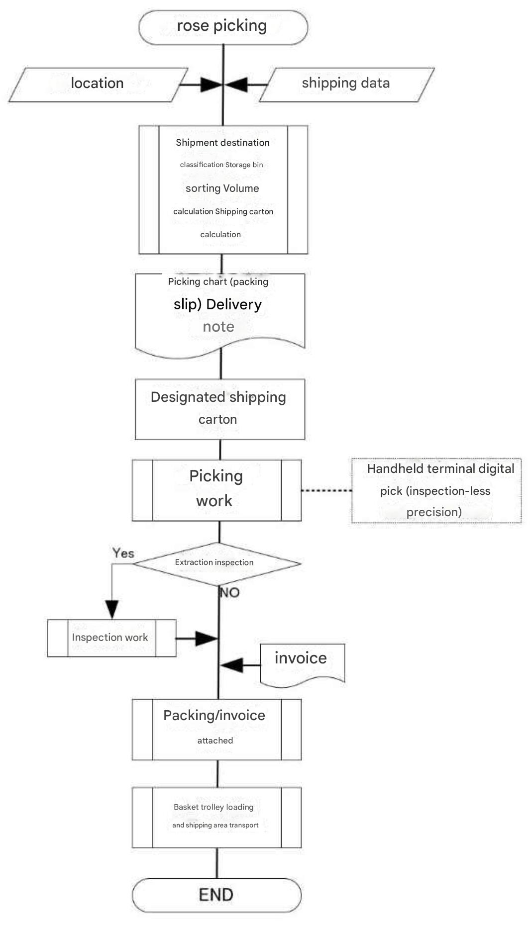 1. Information processing before picking, linking shipping data records with location management shelf numbers, and tallying and sorting shelf numbers by destination. Calculating volume by destination and allocating optimal shipping cartons. 2. Issuing a picking chart (packing details, not used during picking) and delivery note. 3. Packing designated shipping cartons (folded). 4. Starting picking using a handheld terminal or digital picking (requires an information system and operational management to guarantee no inspection required). 5. For cartons designated for sample inspection, restart from step 6 after shipping inspection. 6. Scan the code on the picking chart and issue a shipping label. 7. Place the picking chart and delivery note into the shipping carton, seal it, and then attach the shipping label to the shipping carton. (Packaging is not required for shipping containers.) 8. Load the designated shipping carton onto a cart. 9. Repeating steps 1-8, confirming that picking has been completed at the designated shipping destination, and transporting the cart to the shipping area without inspection requires volume management, information processing for shipping carton allocation, and advanced work (operation) management. |