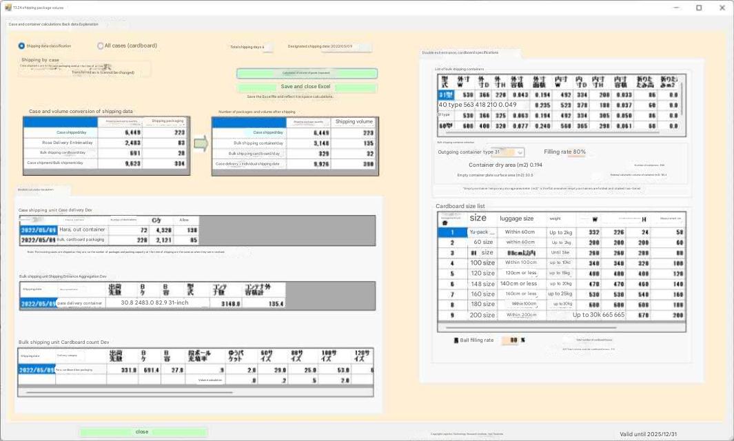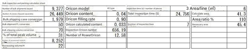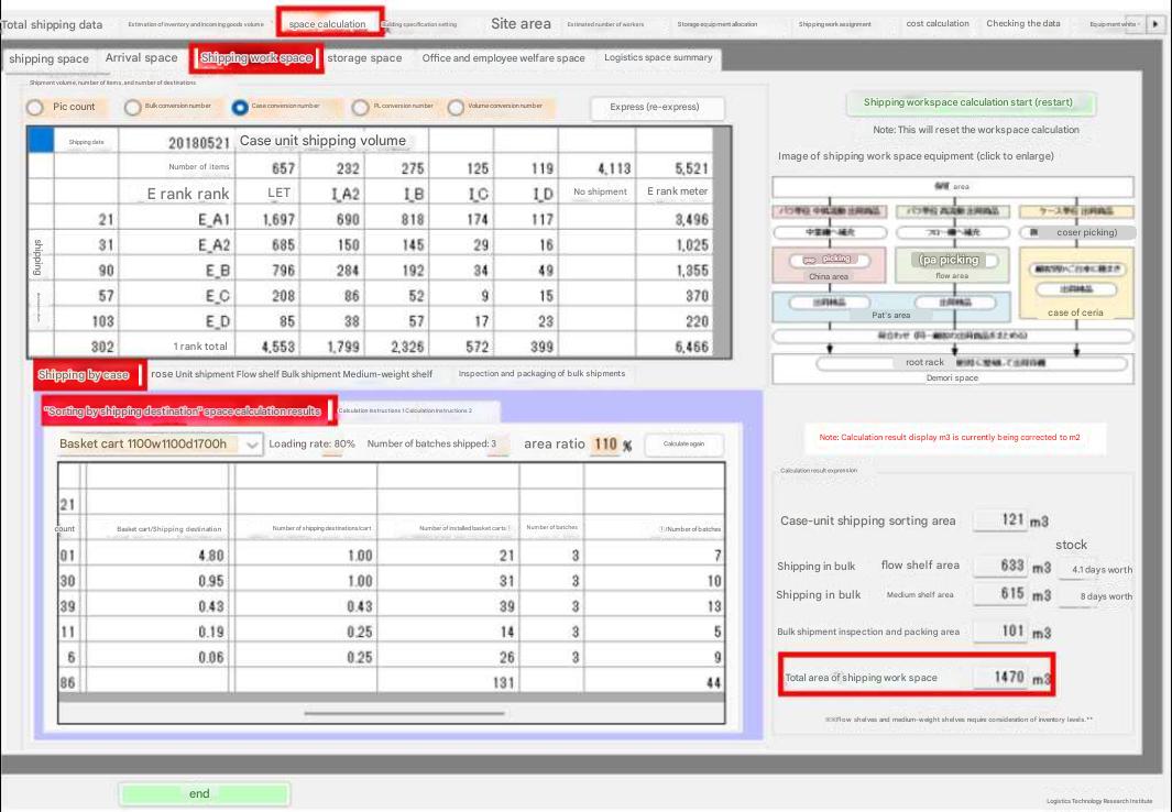 | The shipping work space is the space where products taken out of the storage space by item are sorted for case shipments, and picked for loose shipments and arranged by destination. Inspection and packaging work is also included in this space. The order of the process is the storage space first, then the work space, and finally the shipping space. The order of consideration is reversed because shipping is the basis, from the shipping space calculation to the shipping work space and then the storage space. Since the calculation is based on the assumption that all products are in the storage space at the time of shipping, matters related to receiving are not included in the shipping consideration. |