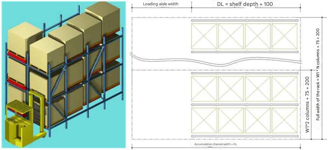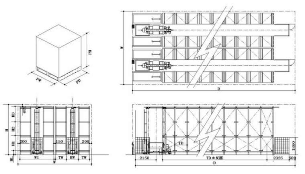 : For all calculations oftera1100W1100D 1350H (including PL height 150 mm). In terms of storage packaging, placing one item on one pallet is called single-load storage (single-load PL ), while placing two items on one pallet is called double -mixed storage ( double -mixed PL ). Mixed storage is classified as mixed by writing the number of mixed items at the beginning of the name. Products on a pallet are stacked vertically (called vertical stacking) to prevent mixing with other products. For this reason, mixed PL has lower storage efficiency than single-load. PL fixed shelves are used in most distribution centers, and because pallets are supported by beams (cross beams), loading aisles can be installed between the shelves ( called dual shelving ), allowing loading and unloading of products on any pallet at any time. |