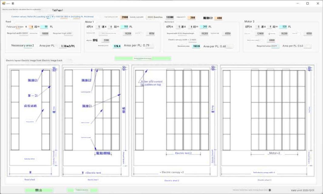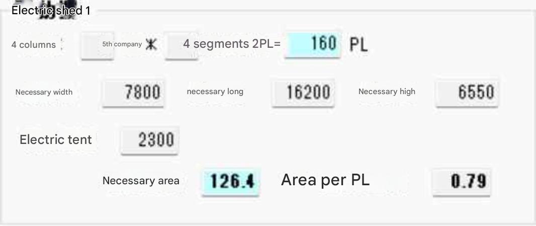 The area per PL of electric shelf 1 is calculated to be 0.79 m2/PL, including the area of the auxiliary aisle. However,