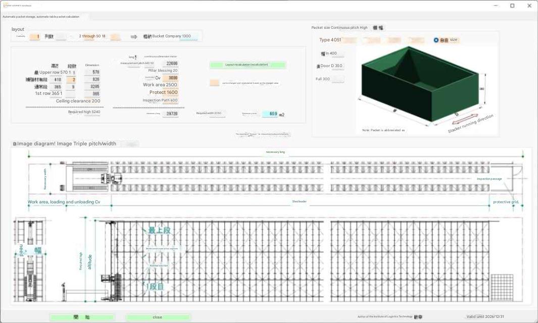 The shelf width is 1910mm for a 51-type container with a shelf depth of 555mm * 2 rows and a crane width of 800mm. The clearance between adjacent buildings is 200mm and the clearance between two cranes is 150mm. |