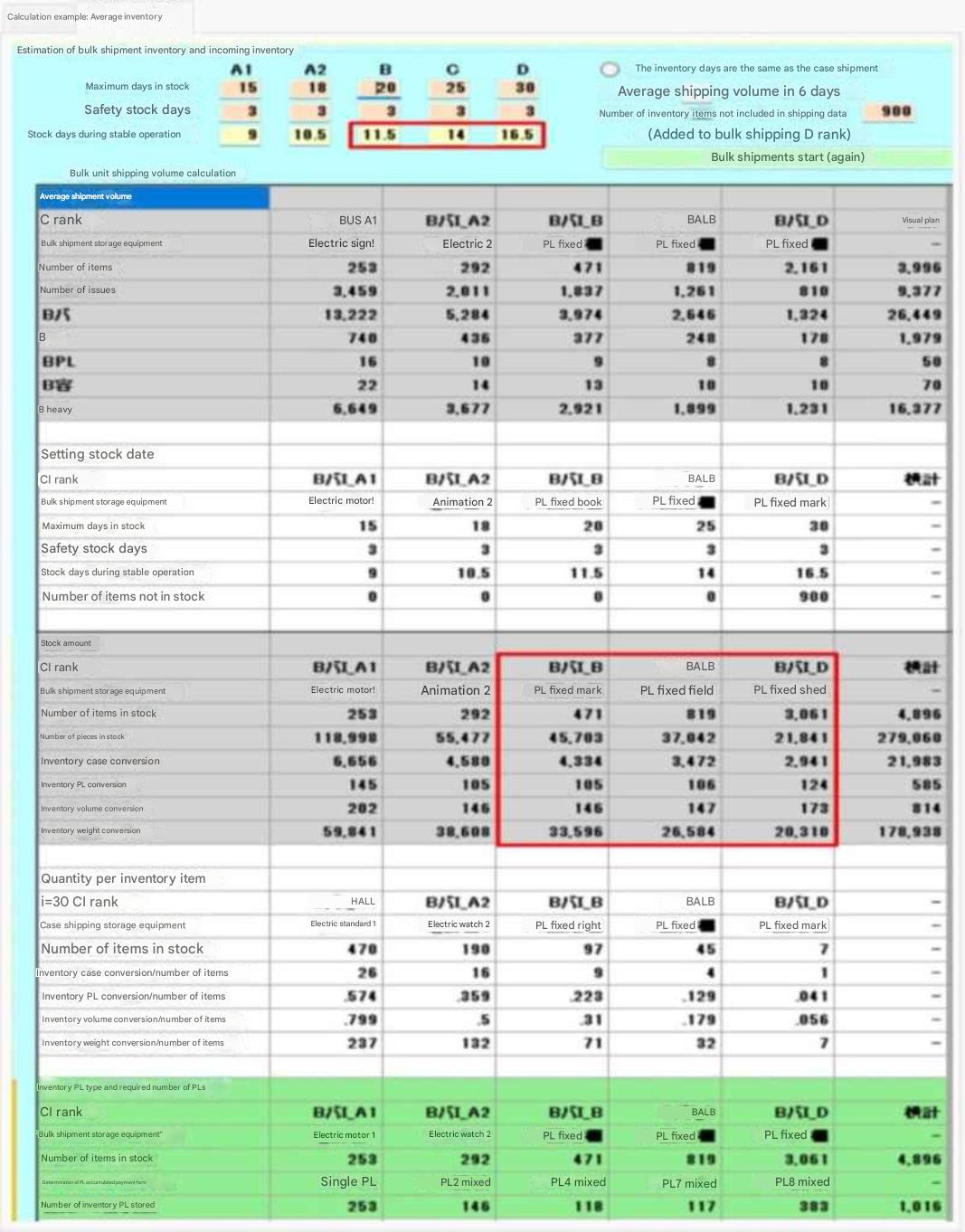 The table on the left is obtained by inventory quantity estimation calculation. Items on the medium-volume shelves are BBaI_B, BBaI_C, and BBaI_D. For how to read the table, see Inventory quantity estimation calculation. |